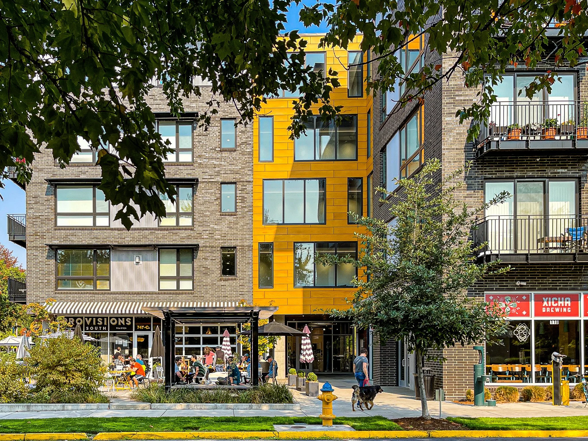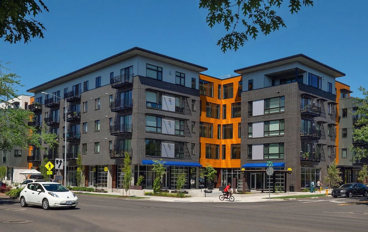 Amazon Corner is a 120,000 sf mixed-use apartment building at 32nd Avenue and Hilyard Street in South Eugene. The building is “four-over-one” with below-grade parking, ground-level retail and residential space, and four floors of residential living above. There are various housing types, from studios to two-bedroom apartments. The developer Mike Coughlin, whose Burley bike trailer company is a well-known local business, is a long-term Eugene resident.