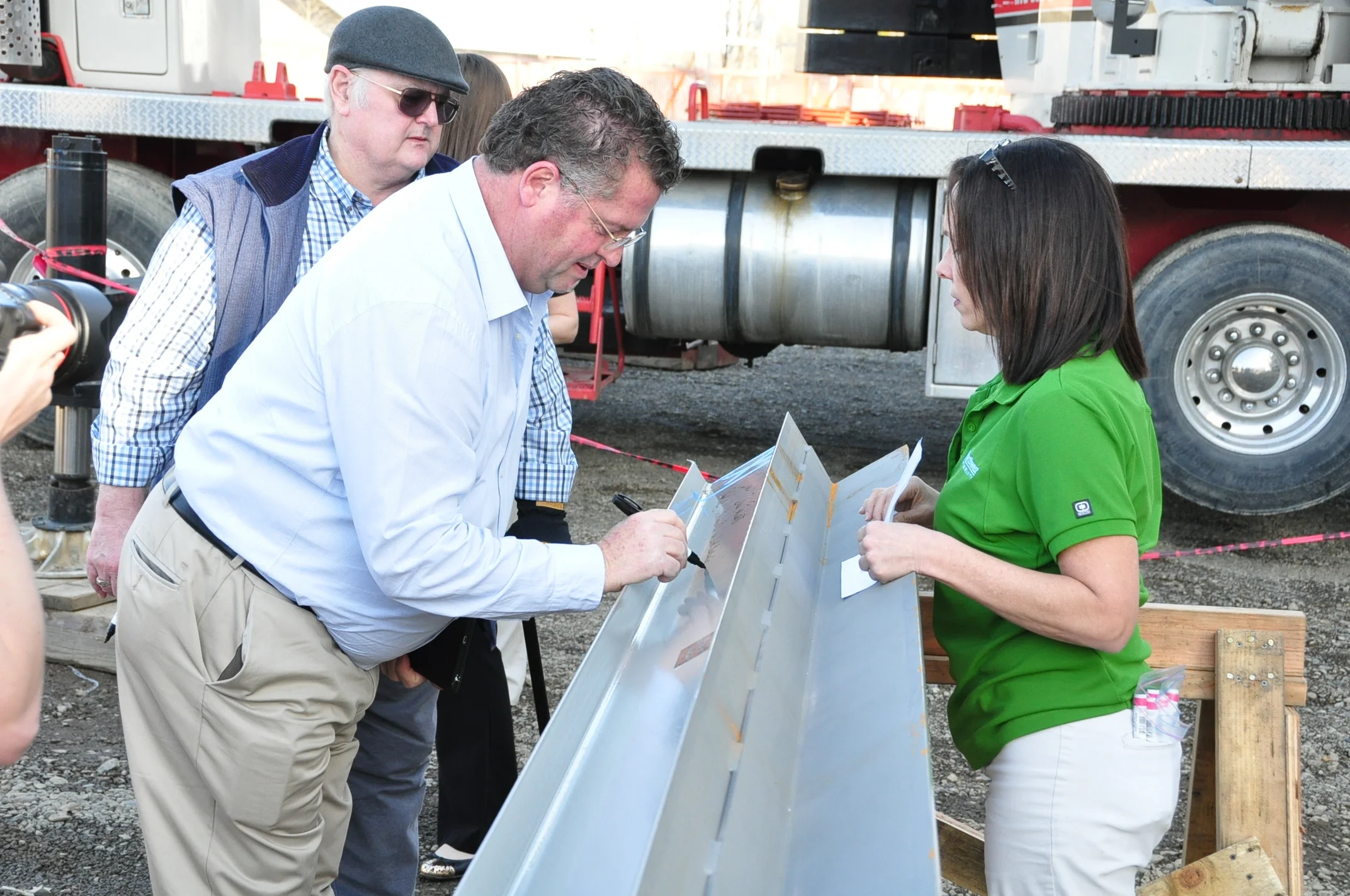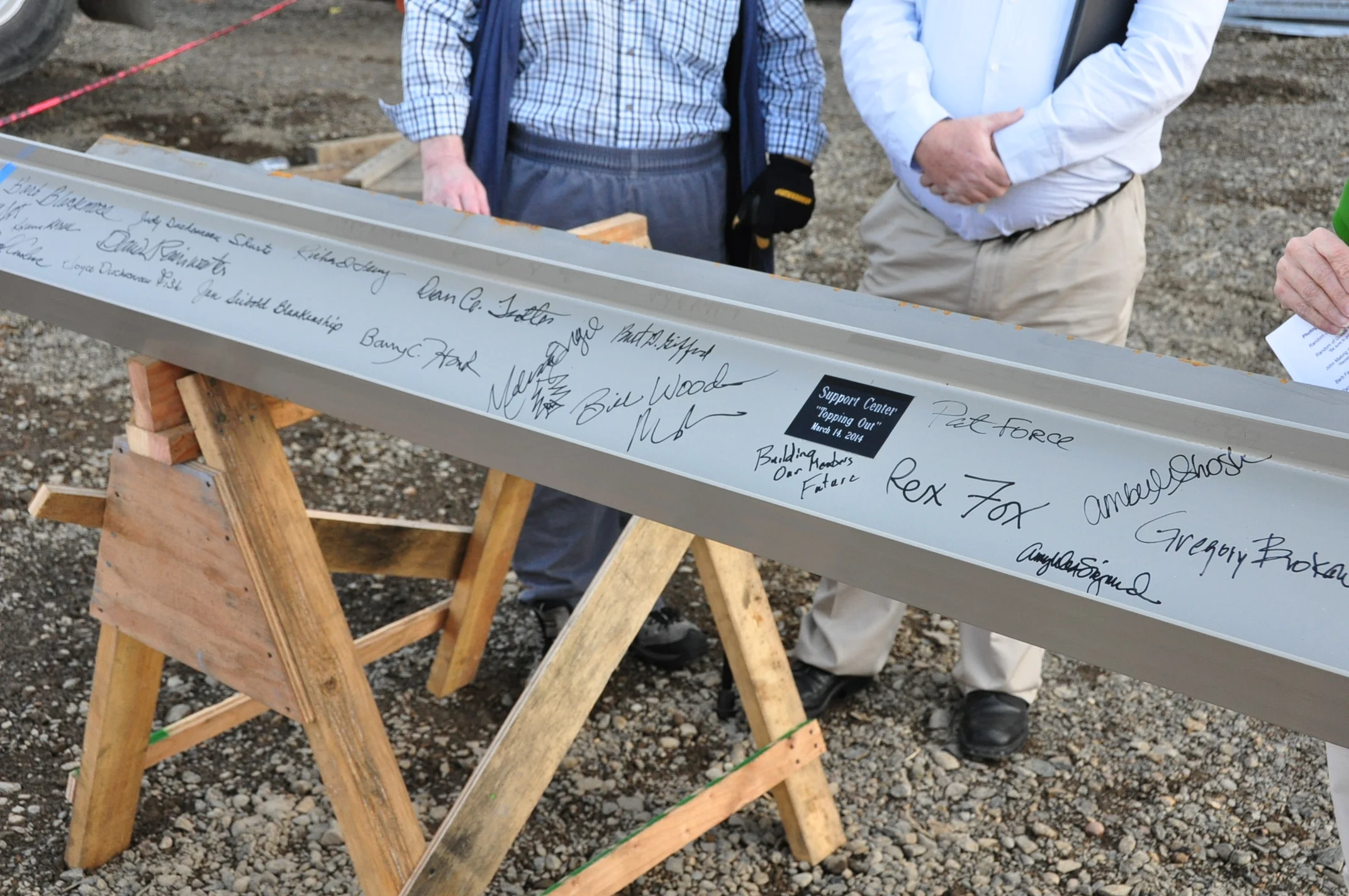 Attendees had the opportunity to sign the last beam before it was hoisted up in the air and secured into place. The signed beam will remain exposed to view at the top of the east stairwell upon completion of the project. It will serve as a reminder of the construction process and the individuals involved in orchestrating the endeavor.