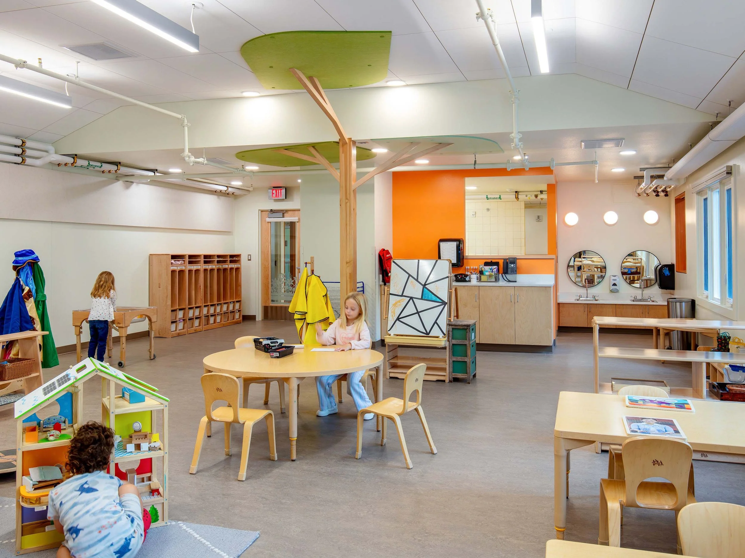 The remodel helps knit together the entire staff. Co-location of administrative staff with classroom activities enables a deeper connection to the Center’s children and their learning. The flexible break room and meeting space is a unique amenity in a project of this type and strategically connects and supports both groups. Every classroom, staff area, and individual office have direct access to daylight and views while offering comfortable acoustic separation and privacy.