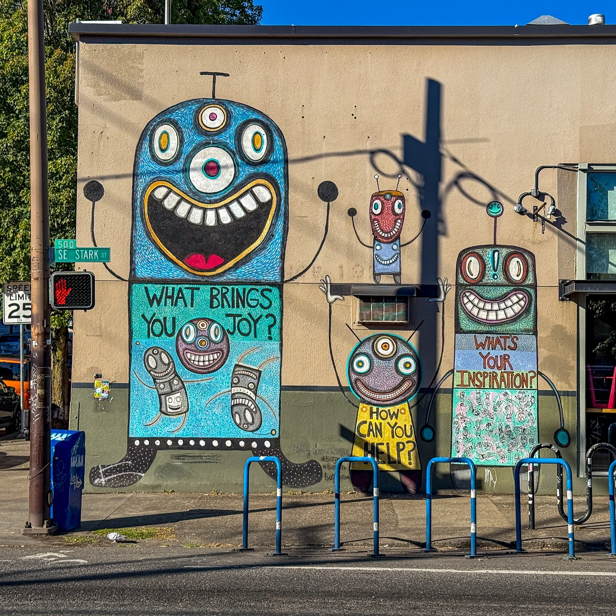 “What brings you joy?”, mural from Questions for Humans project, Gary Hirsch, SE Portland.