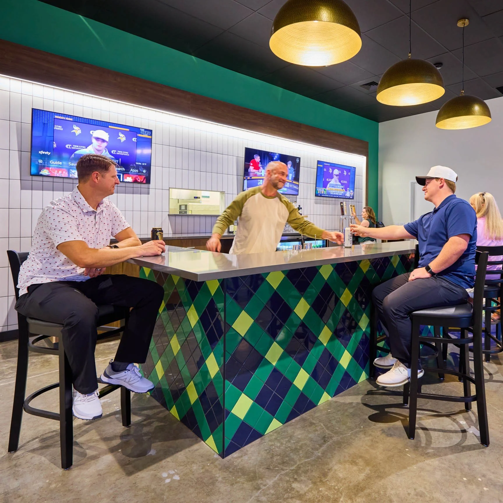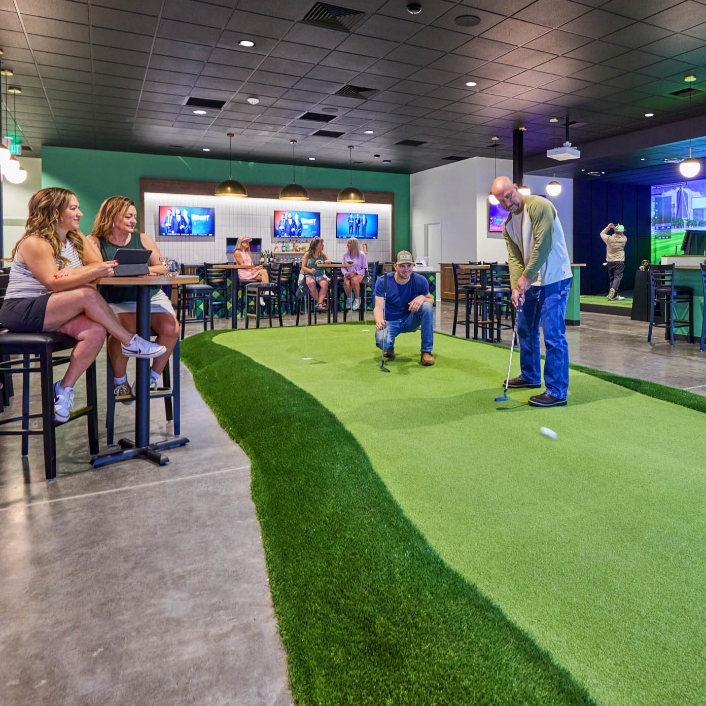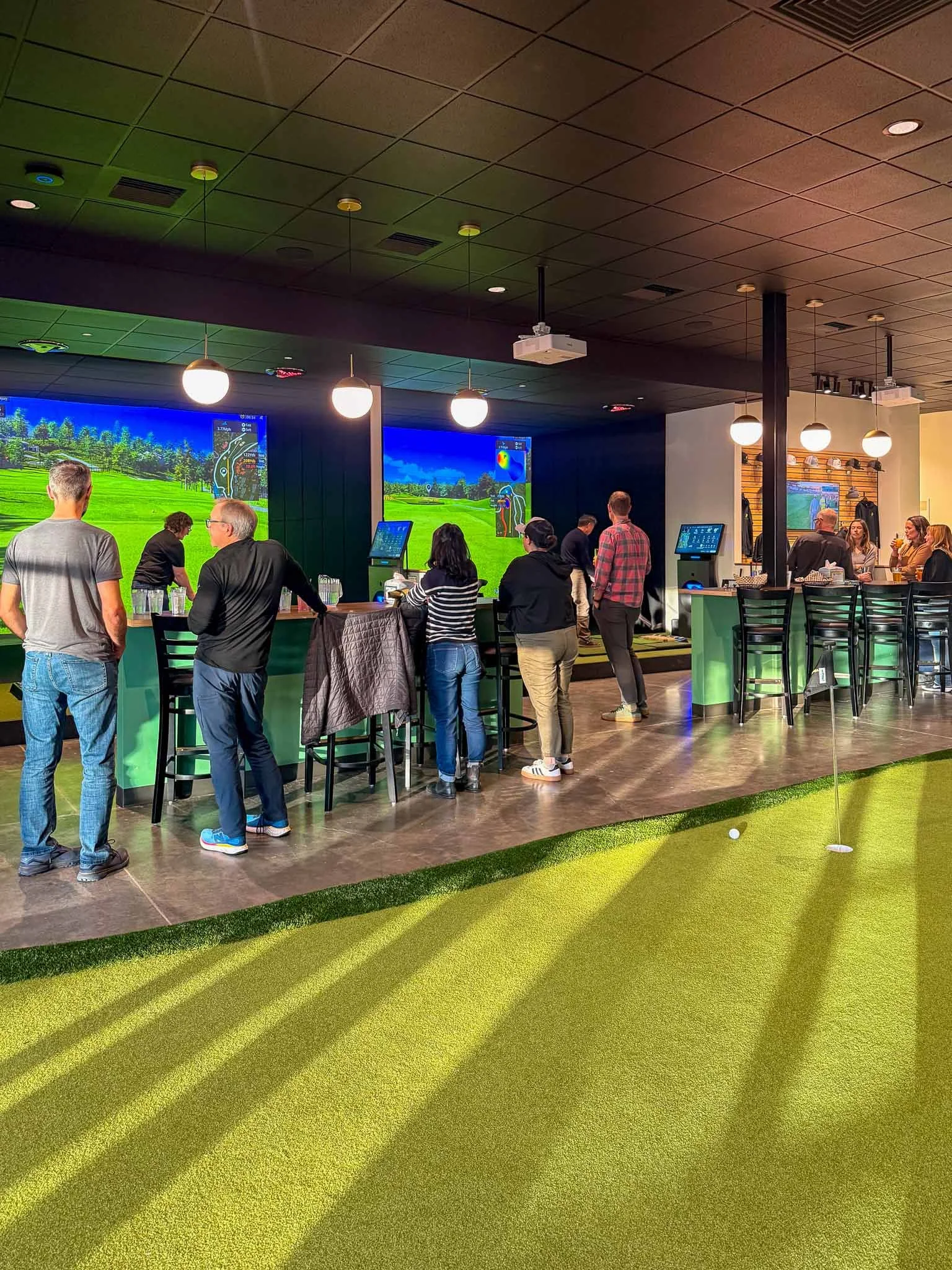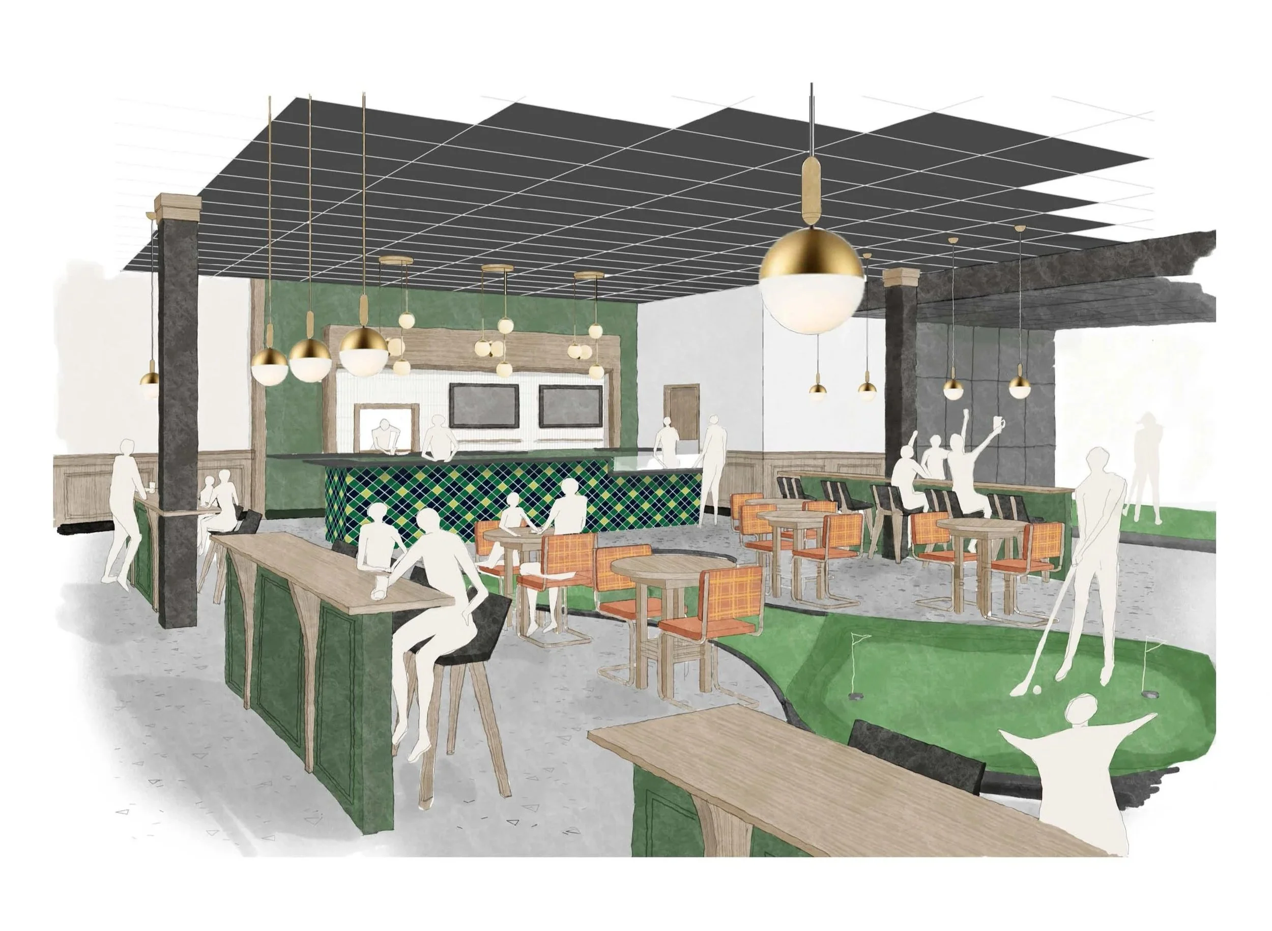 Rowell Brokaw partially renovated 1069 Valley River Way for Fore Seasons Golf by adding a practice putting green, full-service bar, and six top-of-the-line simulators. Flexible seating allows for large group gatherings where teams can play together across multiple simulators at the same time. The design team selected a modern play on a traditional country club color scheme including a bright plaid tile focal point for the bar. Wood accents and brass globe pendants warm up the scheme to create a connected and cohesive social space.