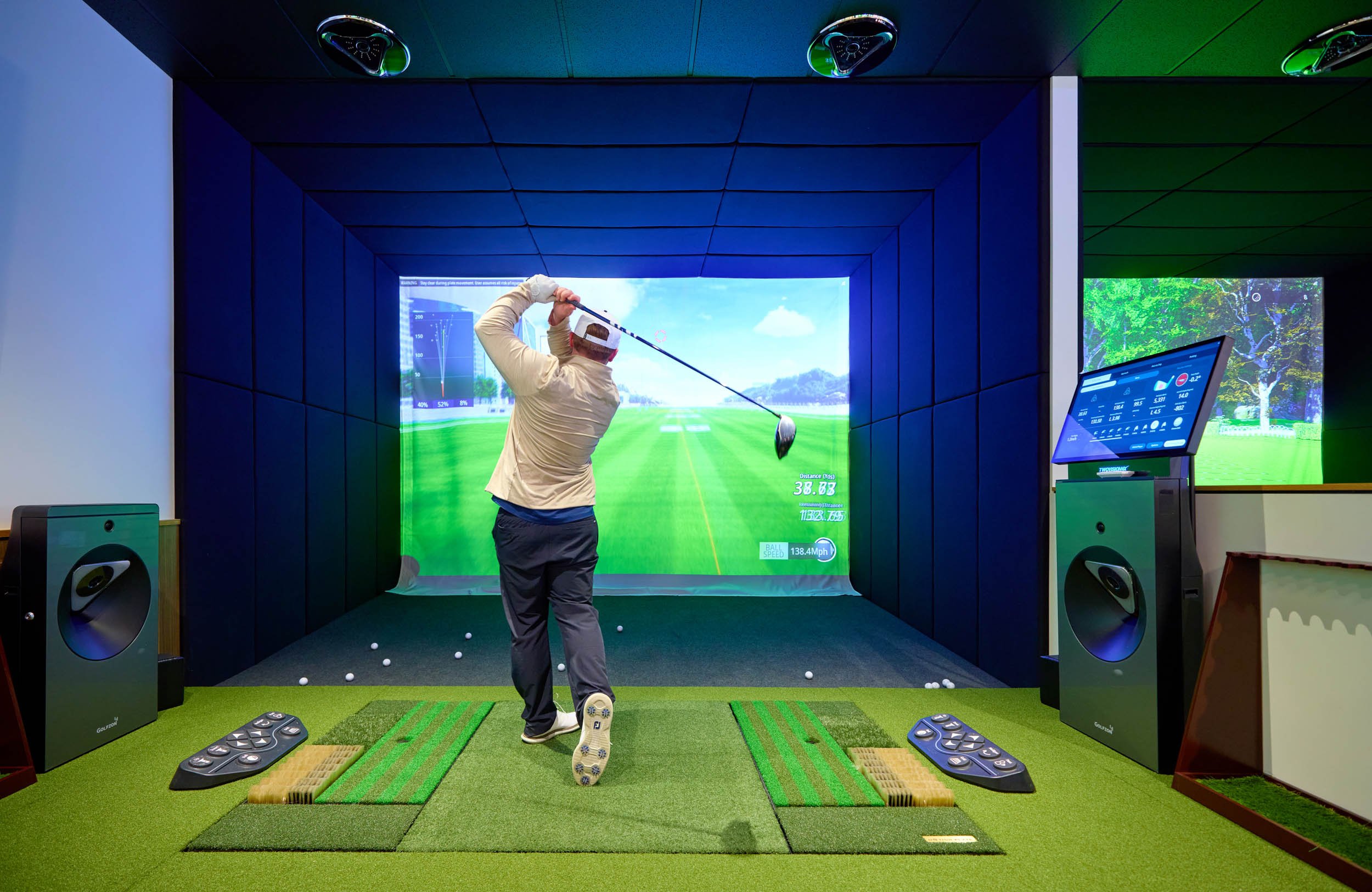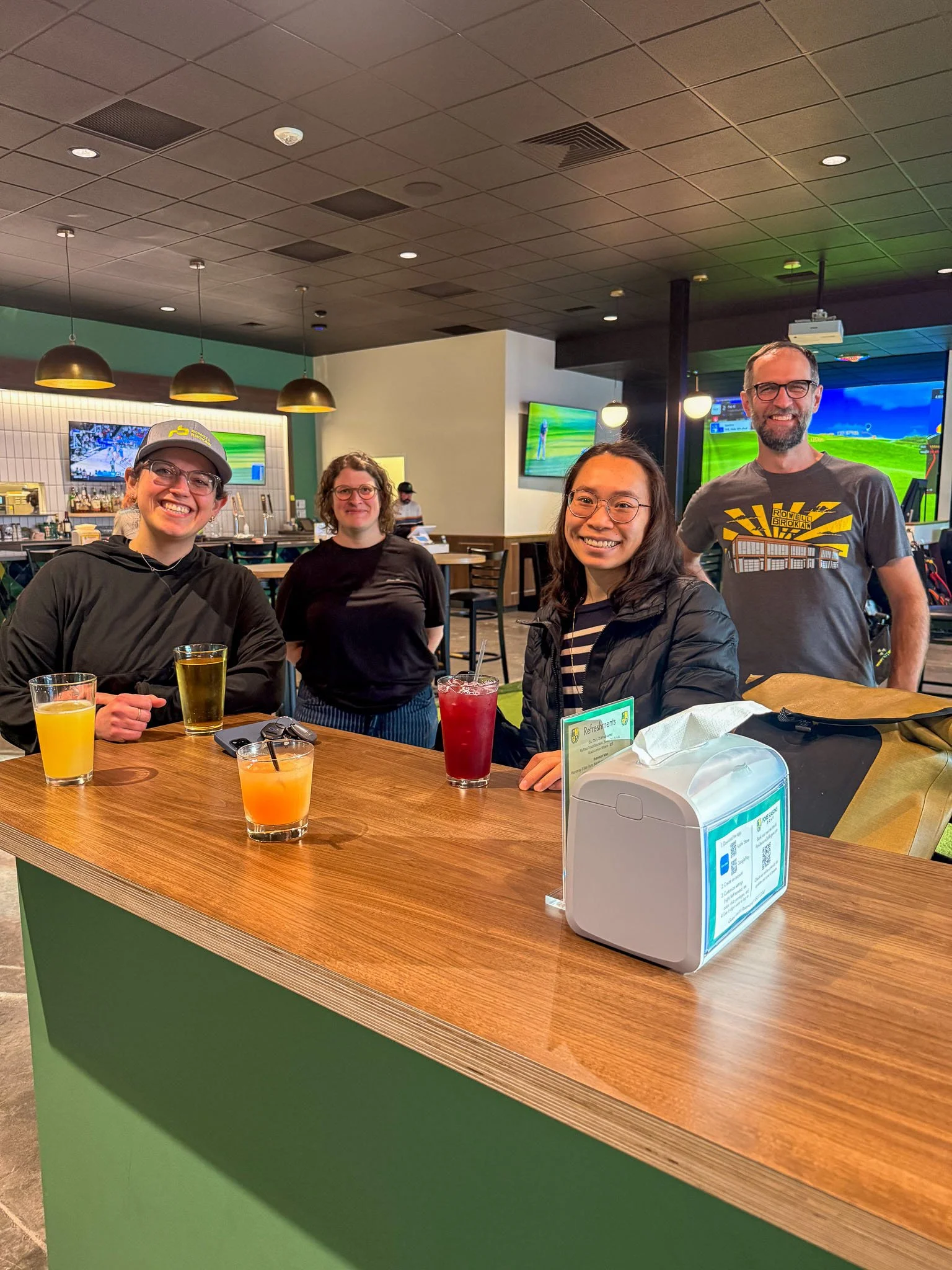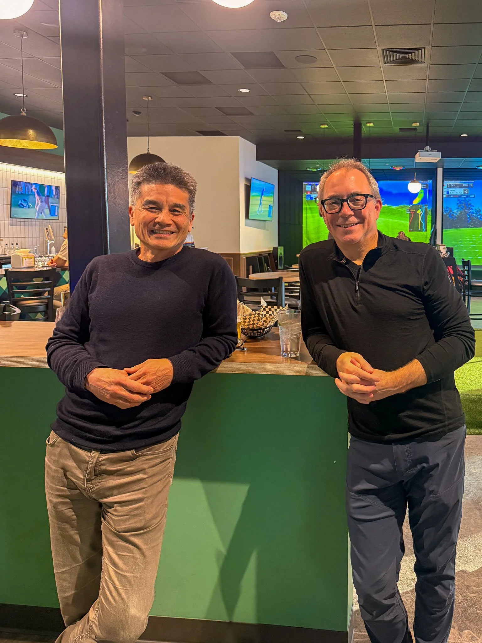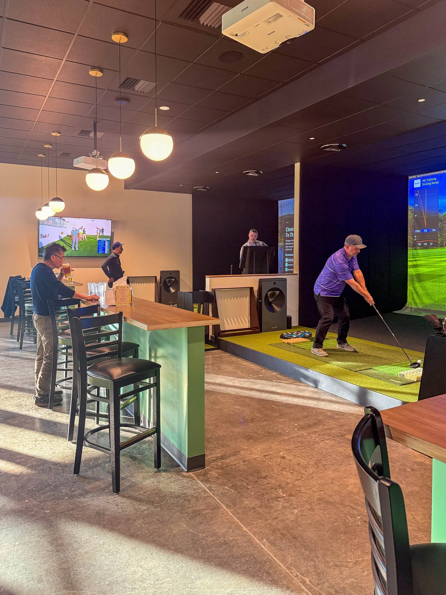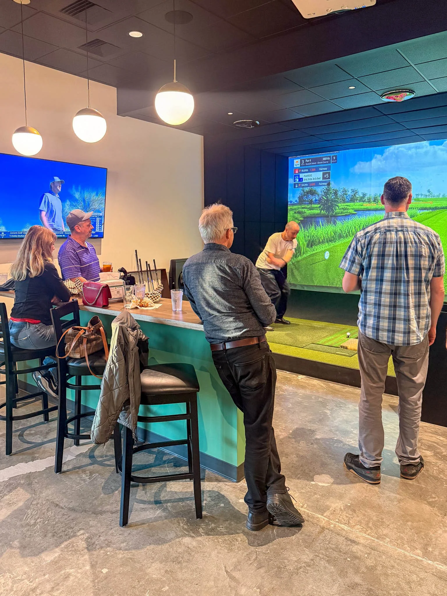 Rowell Brokaw partially renovated 1069 Valley River Way for Fore Seasons Golf by adding a practice putting green, full-service bar, and six top-of-the-line simulators. Flexible seating allows for large group gatherings where teams can play together across multiple simulators at the same time. The design team selected a modern play on a traditional country club color scheme including a bright plaid tile focal point for the bar. Wood accents and brass globe pendants warm up the scheme to create a connected and cohesive social space.