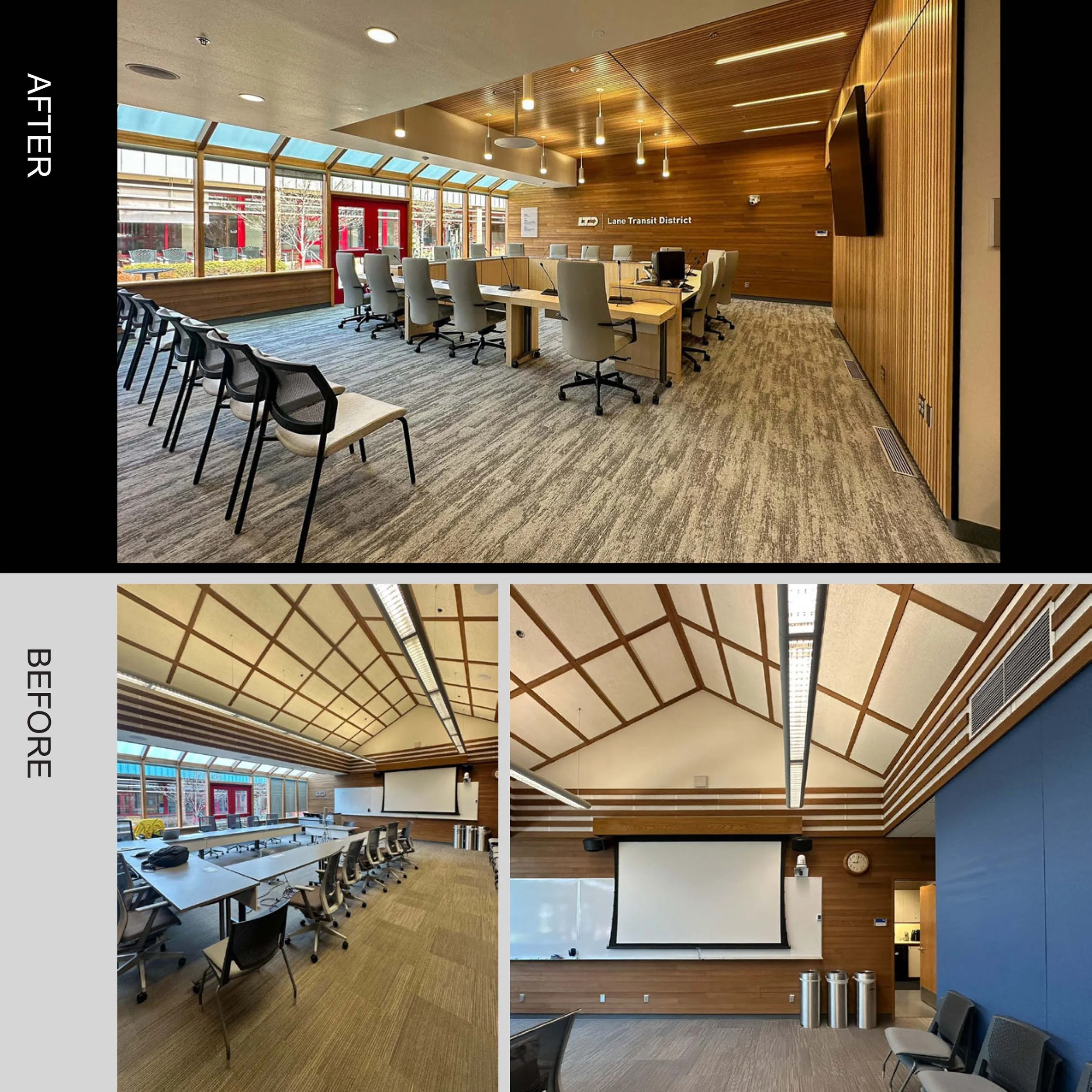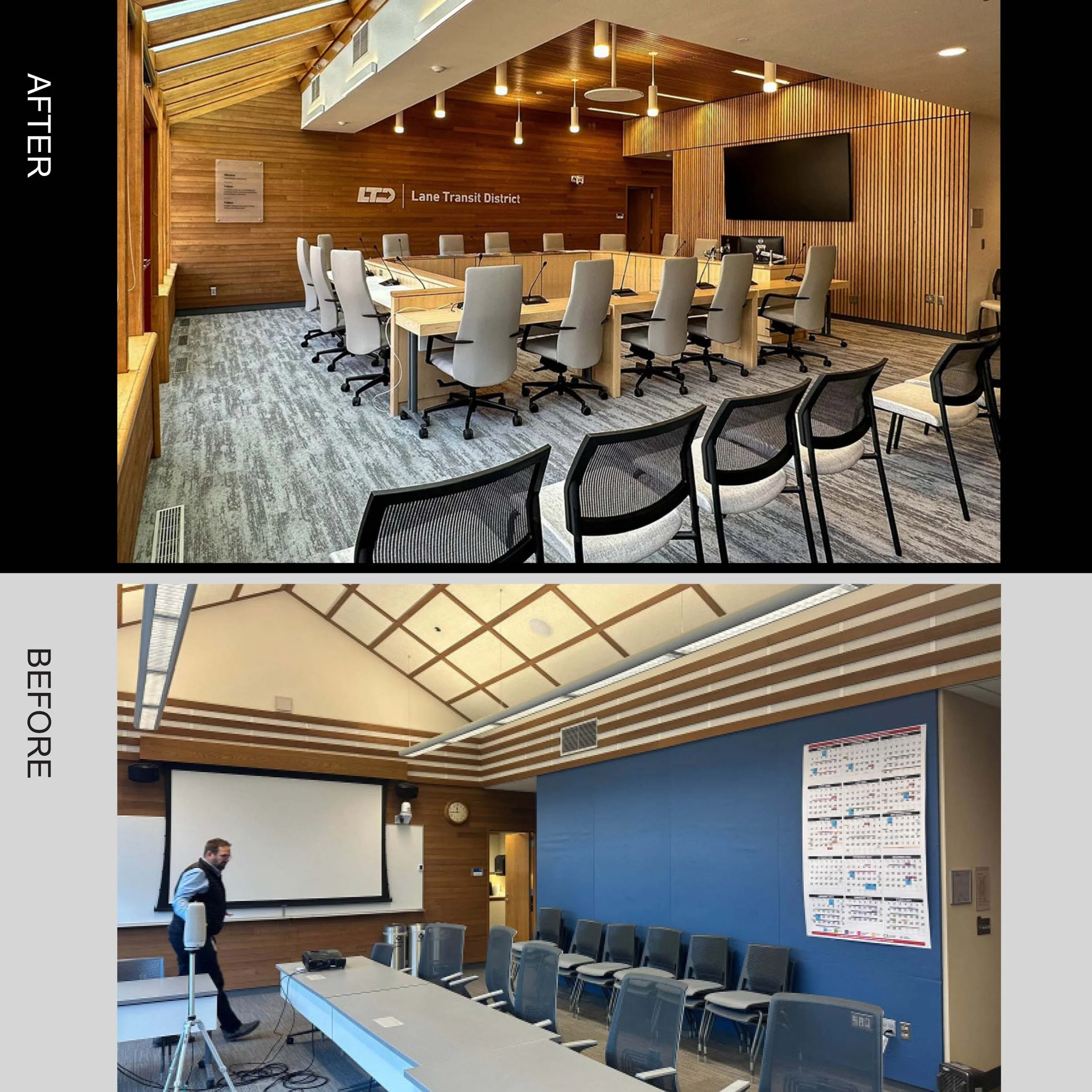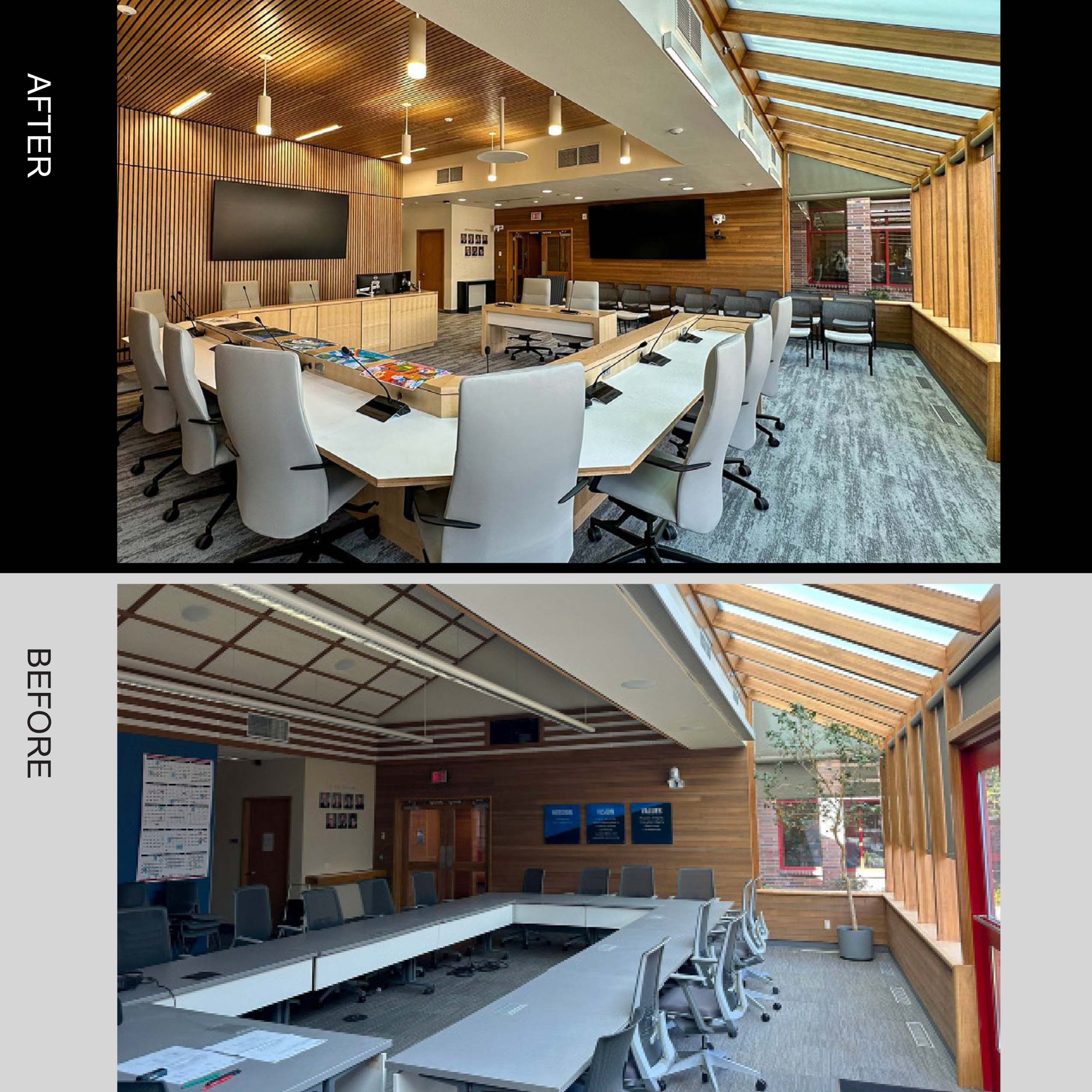 Rowell Brokaw remodeled LTD’s boardroom and adjacent catering/meeting spaces. The boardroom was transformed from a standard meeting room to a more elevated space suitable for public board and committee meetings. The space is designed for both in-person attendance and for broadcast viewing over local TV.