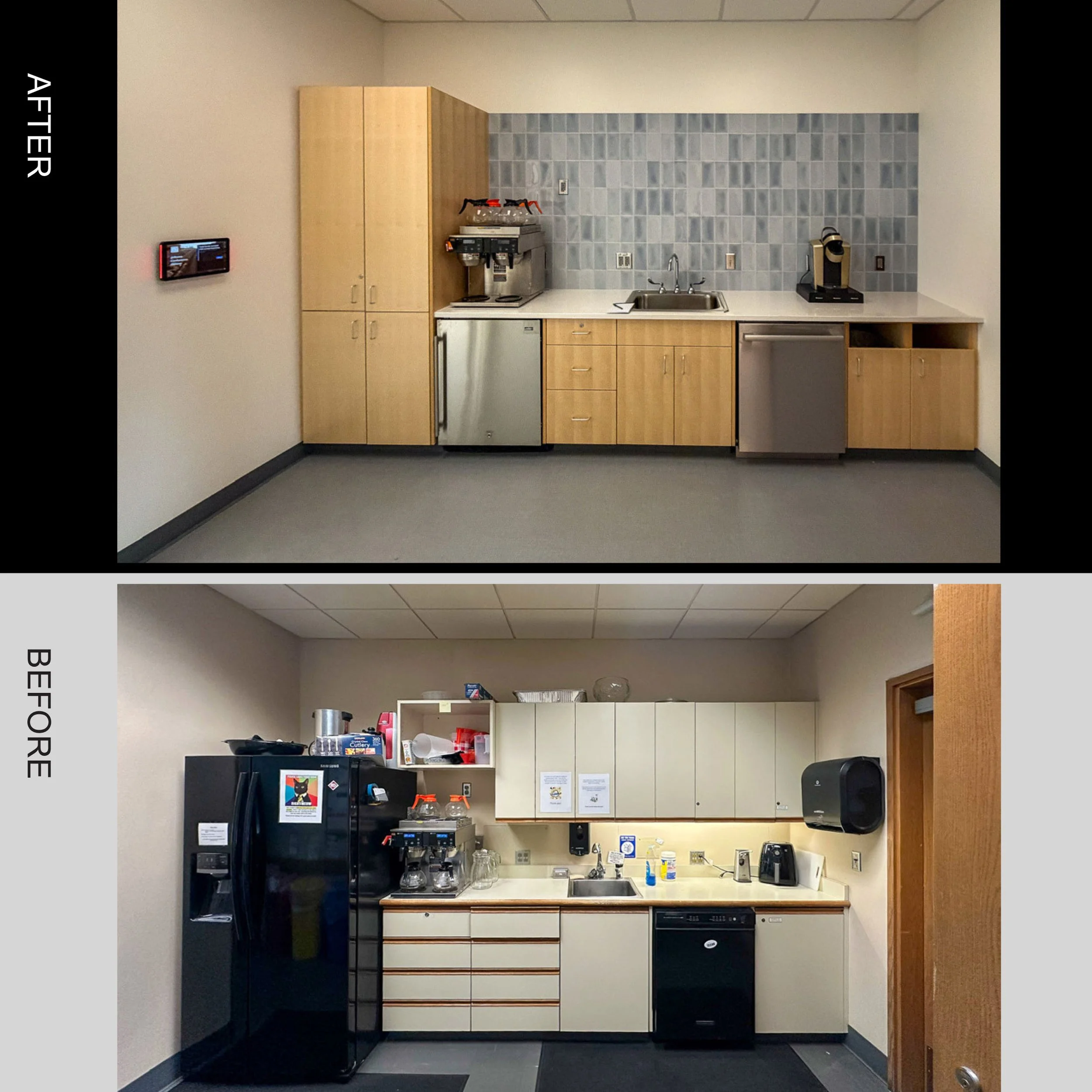 The catering/meeting rooms were refreshed with new finishes, casework and furniture. Finishes in the kitchen space include maple p-lam cabinetry, quartz countertop, and lightly variegated tile.