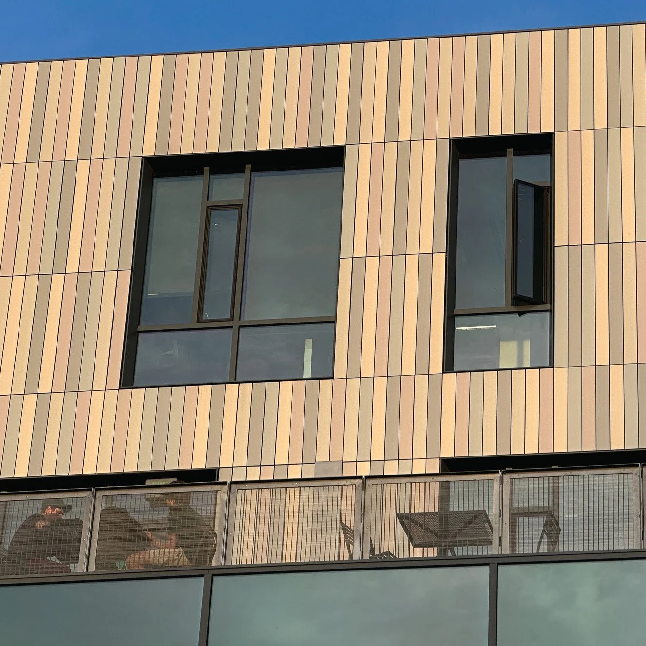 Installing the open-joint terra cotta rainscreen required strategic planning and rigorous detailing. Because of their long lead time, the terra cotta custom tiles, manufactured by Shildan Group in Europe, needed to be precisely integrated with brick and glass, the building’s other materials. The “off the shelf” application of the vertical terra cotta tiles, i.e. using the full width of each tile without cutting or trimming, required custom mullion gaps for window and door transitions. Each tile was individually numbered for color and length to avoid overlapping colors. Streimer installed the terra cotta tiles using hydraulic lifts.