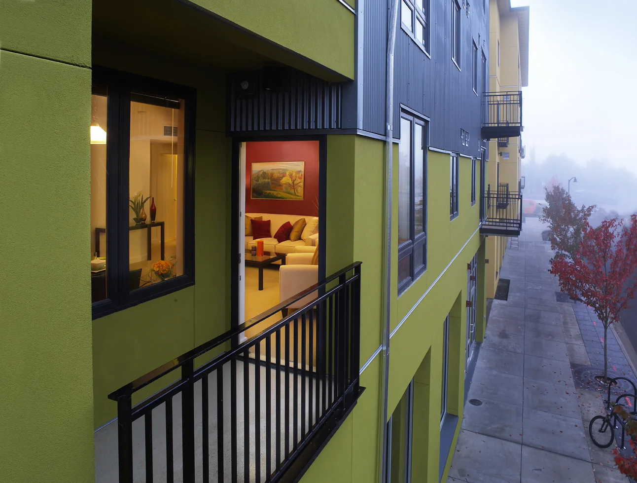 The housing above the retail has some of the widest variety of unit sizes and design layouts of any residential buildings this size. Units range from 475 sf to over 1,600 sf. On the fourth floor of each building several units are two levels tall with double-high living volumes offering spectacular views of the the neighboring hills.
