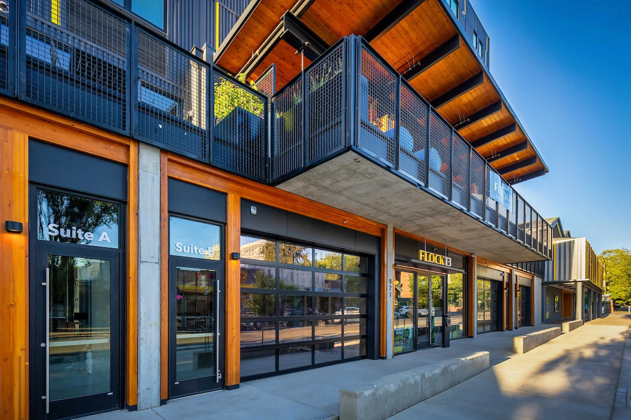 Flock13 engages the street via its transparent ground-floor retail and its open second-floor terrace. A series of glass panel garage doors open onto outdoor seating and space for retail. A large overhanging canopy shelters the terrace and street entry, while creating a sense of building scale that responds to The Duck Store. Timber accents further connect these lower floors with the canopy and lend warmth to the façade.