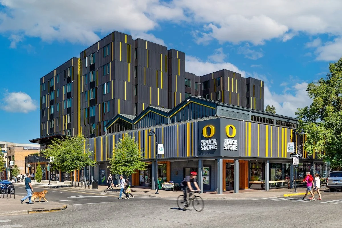 Arlyn Schaufler, CEO of The Duck Store, sums up the overarching goal of the exterior refresh and the new mixed-use building: “From the beginning stages, it was essential to us that this project build on what generations of Ducks love about our neighborhood—a thriving mix of student-centric businesses and a welcoming atmosphere for all.”